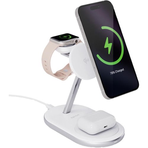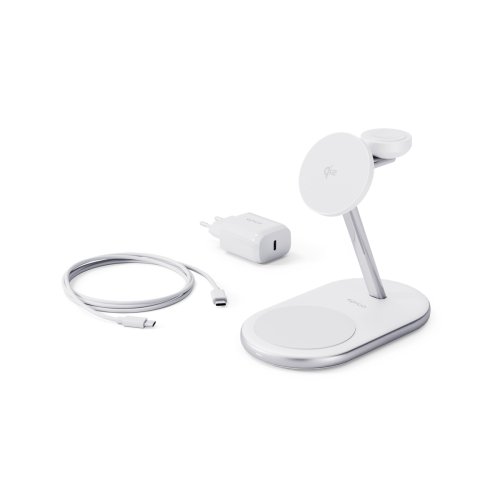 Elegantní design: Vyrobeno z prémiových materiálů, které z této nabíječky dělají krásný doplněk na váš stůl. Certifikace Qi2 & kompatibilita s MagSafe: Užijte si až 2x rychlejší bezdrátové Qi2 nabíjení pro iPhone (15W) s pevným magnetickým uchycením. 3v1 nabíjení: Nabíjejte současně smartphone, Apple Watch (5W) i AirPods (5W). Certifikace Made for Apple Watch: Certifikováno společností Apple pro zajištění plné kompatibility s budoucími aktualizacemi a bezchybný výkon Stabilní gumová základna: Vybavena protiskluzovou gumovou základnou pro lepší stabilitu. Flexibilní umístění: Podporuje umístění smartphonu na výšku i na šířku. Kompletní balení: Součástí je 30W síťová nabíječka a USB-C na USB-C kabel.