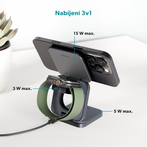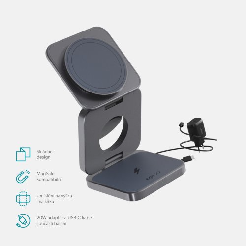 Kompaktní cestovní nabíječka pro všechna vaše zařízení Kompatibilita s MagSafe a Qi2: Bezpečné magnetické připojení pro pohodlné bezdrátové nabíjení.15W bezdrátový výstup: Poskytuje až 15W bezdrátové nabíjení pro kompatibilní smartphony a 7,5W pro iPhony. 3v1 nabíjení: Nabíjejte současně smartphone, Apple Watch (3W) i AirPods (5W). Skladný design: Ve složeném stavu nezabere skoro žádné místo ? perfektní na cesty i doma. Flexibilní umístění: Nastavte si obrazovku do ideálního úhlu ? na výšku nebo na šířku ? s režimem StandBy pro zobrazení času a oznámení. Protiskluzová silikonová základna: Udrží nabíječku pevně na místě. LED indikátor: Mějte přehled o stavu nabíjení na první pohled.