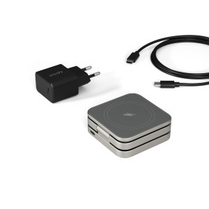 Bezdrátová nabíječka 3v1, 15 W maximální bezdrátový výstup (7,5 W pro iPhone), nabíjecí základna 5 W, modul pro Apple Watch 2,5 W, 25W adaptér a USB-C kabel v balení, barva titanová.