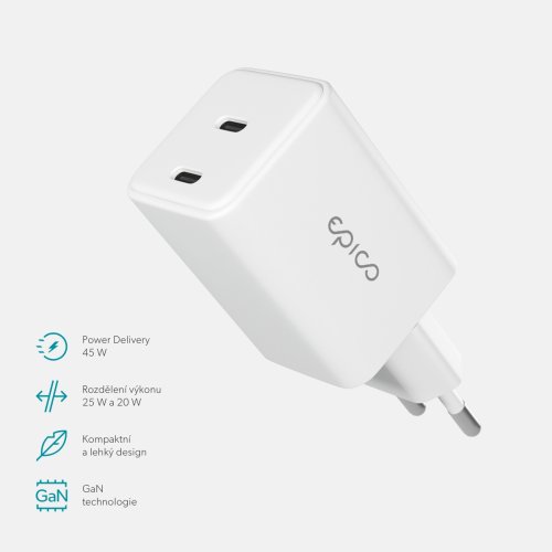 Rychlé nabíjení 45 W: Ideální pro rychlé a spolehlivé nabíjení telefonů, tabletů, menších notebooků, a dalších zařízení. Dva USB-C porty: Dva USB-C porty s technologií Power Delivery umožňují nabíjet dvě zařízení najednou. Technologie GaN: Menší, chladnější a úspornější pro pohodlnější nabíjení. Ideální na cesty: Díky lehkému a kompaktnímu designu nabíječku snadno vezmete kamkoliv s sebou. Vestavěné bezpečnostní prvky: Spolehlivé nabíjení s ochranou proti zkratu, přepětí, přetížení a přehřátí.
