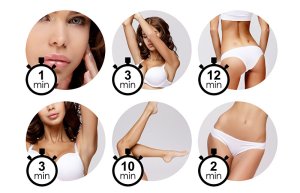 Oblast nad horním rtem: 1 min. Paže: 3 min. Záda: 12 min. Podpaží: 3 min. Nohy: 10 min. Oblast bikin: 2 min.