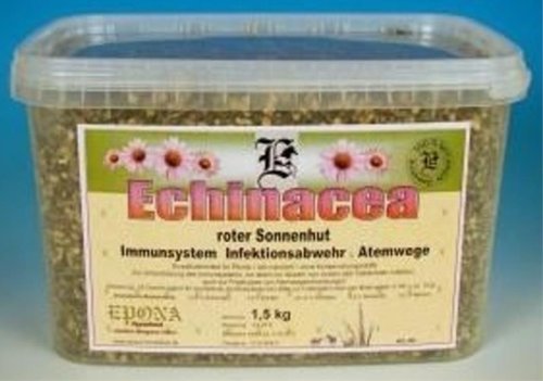 Echinacea - Třapatka nachová. Výborný preventivní prostředek proti respiračním onemocněním. Echinacea je přírodní antibiotikum a prostředek proti infekcím, virům a bakteriím v organismu. Obsahuje několik chemických látek, které hrají velkou roli v léčebných účincích rostliny, mezi ně patří polysacharidy, glykoproteiny, alkamidy, esenciální oleje a flavonoidy. Je schopna aktivovat bílé krvinky, které pohlcují původce infekce přímo v organismu zvířete, a začnou produkovat protilátky. Díky tomu vykazuje značnou antibiotickou aktivitu a to nejen proti bakteriím, ale také proti virům. Echinacea se používá k prevenci a léčbě bakteriálních a virových onemocnění a pro celkové zvýšení obranyschopnosti organismu. Dále je vhodná k léčbě kataru dýchacích cest, chřipky, zánětů dutin, či obyčejného nachlazení, na záněty močového měchýře, mízních uzlin a v neposlední řadě při kožních problémech a hojení ran. Pomáhá pohlcovat volné radikály vzniklé slunečním zářením a tím se velkou měrou podílí na ochraně kůže. Doporučuje se do stájí, kde je předpoklad šíření virového onemocnění. Vhodné období pro preventivní podávání třapatky je zejména jaro a podzim, kdy bývá imunitní systém koní oslaben. Složení: 100 g obsahuje cca: hrubá vláknina 24,10 %, hrubý protein 15,6 %, popelovina 6,5 %, tuk 1,5%. Doporučená krmná dávka 25 g denně pro koně, 10-15 g denně pony a malá plemena.