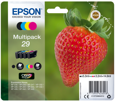 Výhodná sada kazet s pokročilým inkoustovým systémem Epson Claria Home. Ten je zárukou perfektně čitelných textových dokumentů a kvalitních fotografií s hlubokými odstíny černé i zářivými barvami. Jsou určeny pro inkoustové tiskárny Epson Expression řady Home XP-235, XP-332, XP-335, XP-432 a XP-435. Sada obsahuje barevné i černou kazetu.
