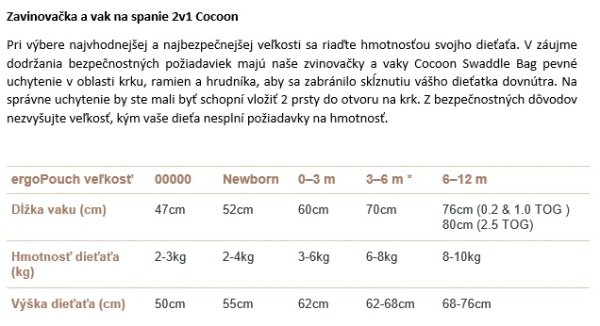 Upozornění: Udržujte mimo dosah tepla a otevřeného ohně. Pro bezpečnější spánek nepoužívejte zavinovačky ani spací pytle, spíte-li spolu s dítětem. Ruce by měly být volné, pokud dítě vykazuje známky otáčení. Návod na oblékání slouží pouze jako návod. prosím, zvažte další faktory, jako je nemoc, klimatizace a to, zda má vaše dítě tendenci být horké nebo studené.