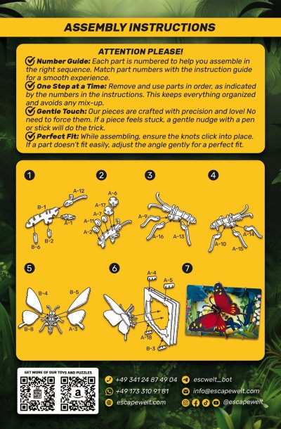3D puzzle Motýl je pro děti zábavné a zároveň výzvou pro rozvoj jejich prostorové představivosti a logického myšlení. Rozvíjí se zároveň také jemná motorika. Toto dřevěné 3D puzzle obsahuje 27dílků, které musí být správně složeny dohromady, aby vytvořily podobu oblíbeného motýla. Jednotlivé díly z dřevěné překližky jednoduše vymáčknete a dle přiloženého návodu krok za krokem skládáte různé modely - dřevěné hračky. Puzzle nemusíte lepit lepidlem, pak je lze kdykoliv rozložit a znovu složit. Doporučujeme si proto ponechat návod ke stavbě. Barevné dřevěné 3D puzzle jsou opatřeny kvalitním potiskem. Tyto dřevěné hračky jsou určeny dětem od 8 let a splňují všechny normy EU. Upozornění: Není vhodné pro děti do 3 let, protože obsahuje malé součásti – hrozí nebezpečí udušení. Balicí materiál není hračka. Hlavní vlastnosti: přírodní dřevěné 3D puzzlerozvíjí jemnou motoriku a představivostvhodné od 8 letjednoduchá obtížnost
