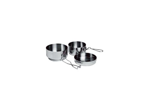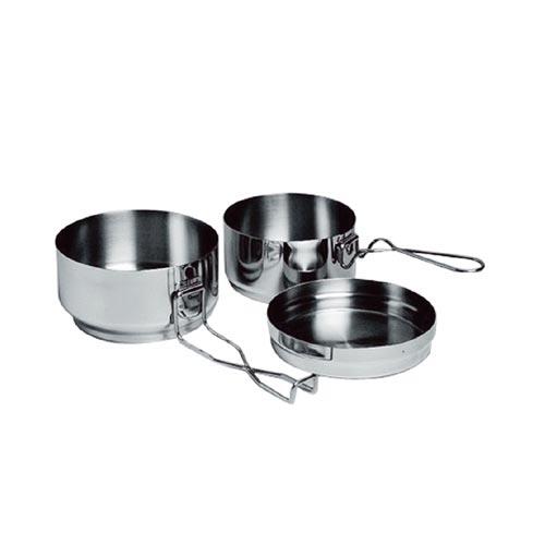 3dílná kempingová sada obsahuje 1 x ešus 15,5 x 9cm (objem 0,9l) + víko + 1 x ešus 13,5cm (objem 0,5l).