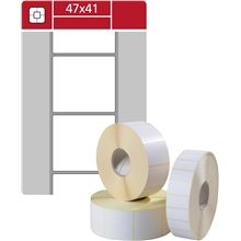 Etikety na kotouči Vyrobeny z termocitlivého materiálu Určeny pro potisk v termotiskárnách a vážních systémech Rozměry etikety: 47 x 41 mm Šíře dutinky: 40 mm Počet etiket na kotouči: 1500 Barva: bílá