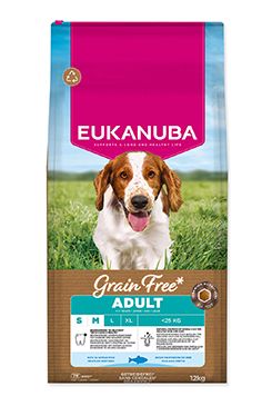 Toto suché krmivo EUKANUBA Grain Free* je speciálně vyvinuto pro dospělé psy malých a středně velkých plemen od 1 roku do 7 let. Složení s nízkým obsahem alergenů a bohatým obsahem mořských ryb je pečlivě navrženo pro psy s citlivostí na obiloviny a podporuje jejich jedinečné nutriční potřeby. Složení bez kuřecího masa nabízí plnohodnotnou výživu s alternativními zdroji sacharidů, včetně hrachu a bezlepkových sladkých brambor*, které poskytují přírodní vlákninu, základní vitamíny a antioxidanty. Krmivo je nabité mořskými rybami a dodává vašemu psovi kvalitní živočišné bílkoviny nezbytné pro budování a udržení silných, štíhlých svalů. Pro další podporu zdravého trávení obsahuje krmivo prebiotické fruktooligosacharidy a řepnou dužinu. Přírodní zdroje omega-6 a omega-3 mastných kyselin navíc podporují zdravou kůži a lesklou srst. Jedinečný tvar granulí v kombinaci s technologií DentaDefense pomáhá udržovat zuby čisté a zdravé. Přidané antioxidanty a vitamíny posilují imunitní systém. Toto 100% kompletní a vyvážené krmivo poskytuje pokročilou výživu pro dospělé psy malých a středně velkých plemen, podporuje optimální tělesnou kondici, celoživotní zdraví a celkovou pohodu. Krmivo EUKANUBA poskytuje kvalitní výživu přizpůsobenou výživovým potřebám vašeho psa.