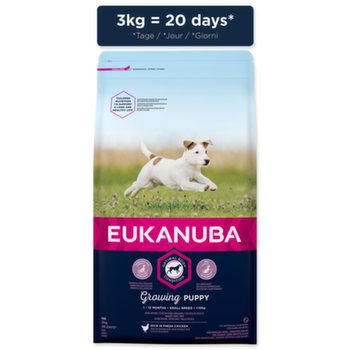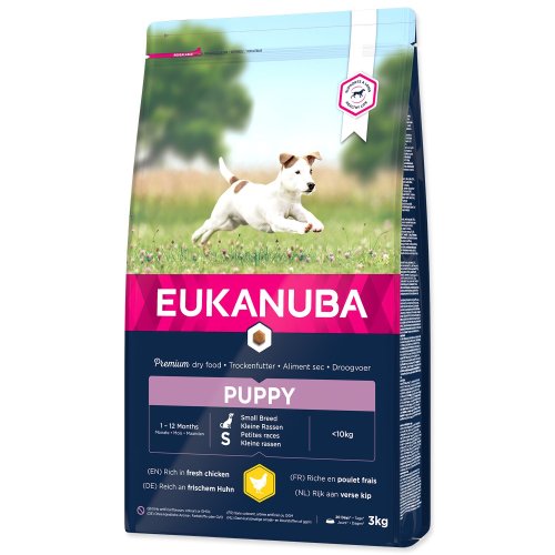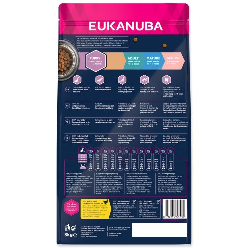 Nová EUKANUBA vylepšená receptura se zaměřením na konkrétní fázi života - pro štěňata malých plemen psů od 1 do 12 měsíců – poskytuje na míru upravenou výživu pro podporu růstu a rozvoje vašeho štěněte. Naše jedinečná na míru upravená receptura pro štěňata malých plemen psů obsahuje DHA, díky které se štěňata rychleji učí a snáze se cvičí, směs vlákniny, prebiotika FOS a řepné dužiny pro podporu zdravého zažívání, vápník pro zdravý růst kostí a přirozený zdroj mastných kyselin omega-6 a omega-3 pro zdravou kůži a srst. Naše unikátní granule ve tvaru šestiúhelníku s přídavkem DentaDefense také pomáhají s udržováním čistých a zdravých zubů. Pokročilá výživa pro štěňata malých plemen psů se zaměřením na podporu optimálního tělesného stavu a celoživotní pohodu.