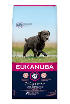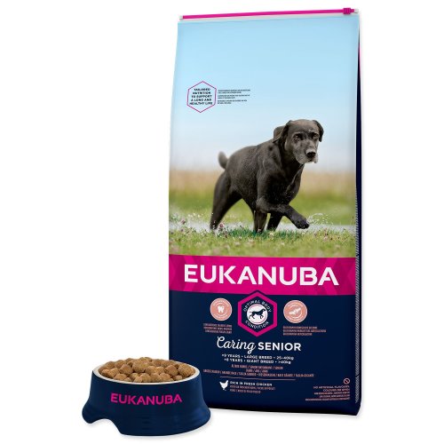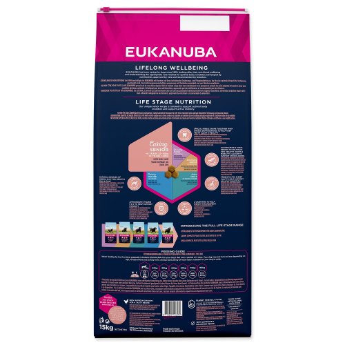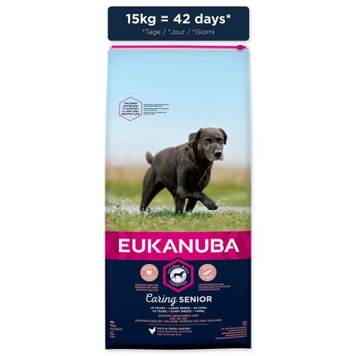 Nová EUKANUBA vylepšená receptura se zaměřením na konkrétní fázi života - pro psí seniory velkých plemen nad 9 let – poskytuje na míru upravenou výživu pro podporu pohyblivosti a optimálního tělesného stavu vašeho psího seniora. Naše jedinečná na míru upravená receptura pro velké psí seniory obsahuje směs vlákniny, prebiotika FOS a řepné dužiny pro podporu zdravého zažívání, vápník pro zdravé kosti, glukosamin a chondroitin pro zdravé klouby, přirozený zdroj mastných kyselin omega-6 a omega-3 pro zdravou kůži a srst, L-karnitin, který pomáhá s udržením váhy a antioxidanty, vitamin E a C pro podporu imunitního systému. Naše unikátní granule ve tvaru šestiúhelníku s přídavkem DentaDefense také pomáhají s udržováním čistých a zdravých zubů. Pokročilá výživa pro velké psí seniory se zaměřením na podporu optimálního tělesného stavu a celoživotní pohodu.