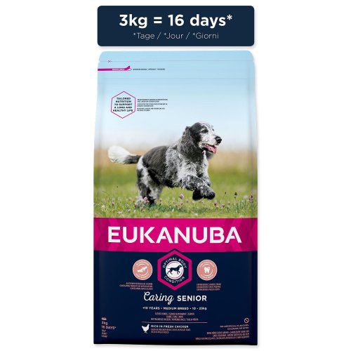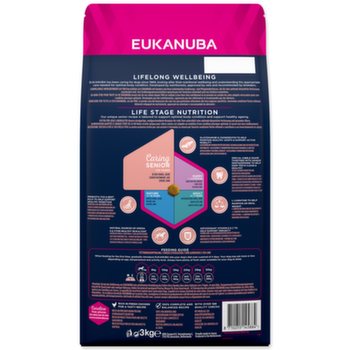 Nová EUKANUBA vylepšená receptura se zaměřením na konkrétní fázi života - pro psí seniory středně velkých plemen nad 10 let – poskytuje na míru upravenou výživu pro zdravé stárnutí a podporu optimálního tělesného stavu vašeho psího seniora. Naše jedinečná na míru upravená receptura pro středně velké psí seniory obsahuje směs vlákniny, prebiotika FOS a řepné dužiny pro podporu zdravého zažívání, vápník pro zdravé kosti, glukosamin a chondroitin pro zdravé klouby, přirozený zdroj mastných kyselin omega-6 a omega-3 pro zdravou kůži a srst, L-karnitin, který pomáhá s udržením ideální váhy a antioxidanty, vitamin E a C pro podporu imunitního systému. Naše unikátní granule ve tvaru šestiúhelníku s přídavkem DentaDefense také pomáhají s udržováním čistých a zdravých zubů. Pokročilá výživa pro středně velké psí seniory se zaměřením na podporu optimálního tělesného stavu a celoživotní pohodu.