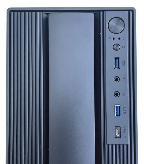 Konektory na předním panelu: 2× USB 3.0, 1× USB-C, 1× sluchátkový výstup, 1× vstup pro mikrofon