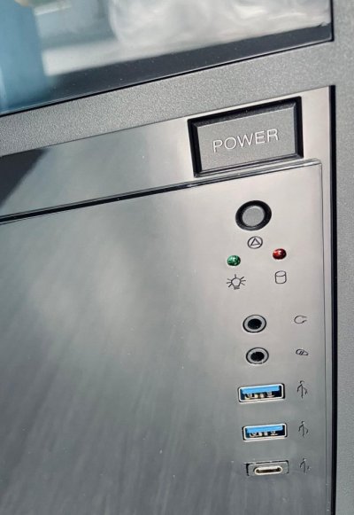 Konektory na předním panelu: 2× USB 3.0, 1× USB-C, 1× sluchátkový výstup, 1× vstup pro mikrofon