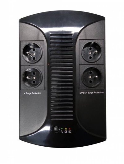 Na čelním panelu spínač ON/OFF a 3 indikační LED (provoz ze sítě - zelená, nabíjení baterie - žlutá, provoz z baterie – červená).
