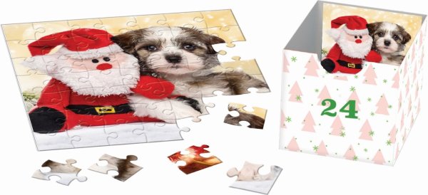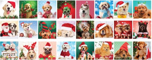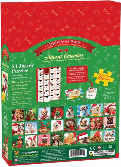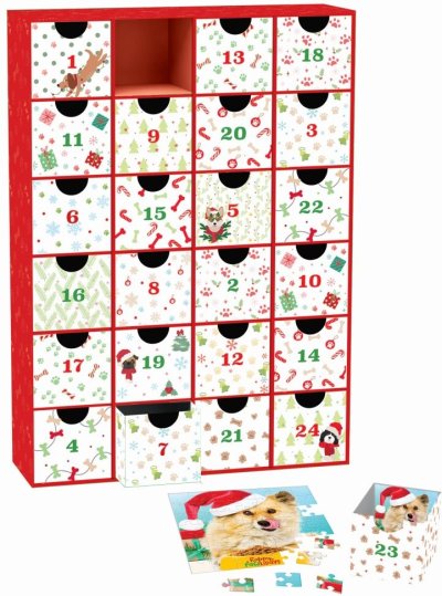 kalendář obsahuje 24 různých puzzle obrázků s motivem vánočních psů, každé puzzle má 50 dílků, obrázky mají čtvercový tvar a rozměr jednoho puzzle je 12,5 x 12,5 cm, kalendář obsahuje 24 šuplíků a je znovu použitelný (pro příští rok si s jeho pomocí můžete vytvořit originální adventní kalendář naplněný drobnostmi nebo něčím sladkým), rozměr přihrádky je cca 6,5 x 6 x 7,5 cm, vzadu v každém šuplíku je vyobrazená předloha skládaného obrázku.