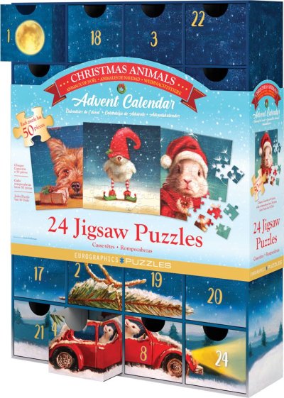 kalendář obsahuje 24 různých puzzle obrázků s motivem vánočních zvířátek každé puzzle má 50 dílků obrázky mají čtvercový tvar a rozměr jednoho puzzle je 12,5 x 12,5 cm kalendář obsahuje 24 šuplíků a je znovu použitelný (pro příští rok si s jeho pomocí můžete vytvořit originální adventní kalendář naplněný drobnostmi nebo něčím sladkým) rozměr přihrádky je cca 6,5 x 6 x 7,5 cm vzadu v každém šuplíku je vyobrazená předloha skládaného obrázku