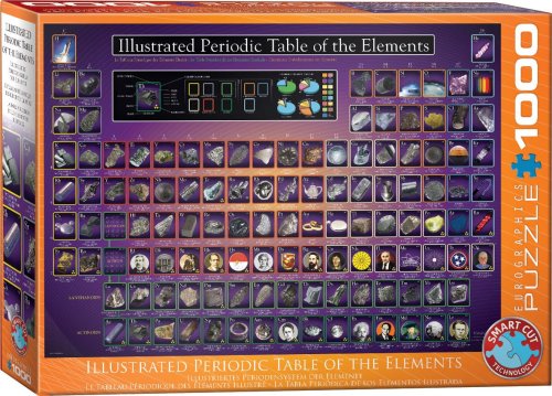 Puzzle znázorňující Periodickou neboli Mendělejevovu tabulku prvků. Kromě názvu a ilustrovaného obrázku prvku nebo jejího objevitele je uveden také chemický symbol prvku, protonové číslo, relativní atomová hmotnost, radioaktivita a barevně rozlišeno skupenství.