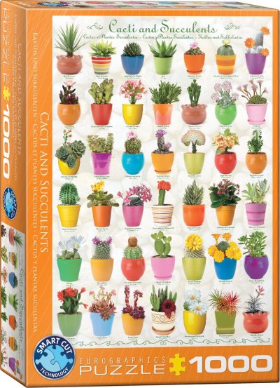 Puzzle EUROGRAPHICS s obrázky nejrůznějších druhů krásně barevných kaktusů a sukulentů. Názvy rostlin jsou uvedeny v anglickém jazyce a latině.