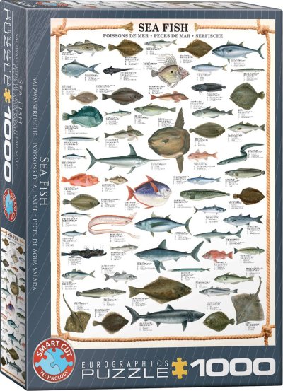 Puzzle zobrazuje nejznámější druhy mořských ryb. U každé ryby je uveden název, hmotnost a délka.