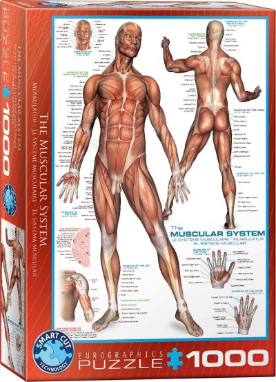 Puzzle pro všechny, které zajímá anatomie lidského těla. Puzzle zobrazuje svaly lidského těla, včetně detailního popisu hlavy a ruky. Popisky obrázků jsou v latině a angličtině. Raznice puzzle EUROGRAPHICS nekopíruje standardní mřížku, rohy a hrany dílků nejsou vždy v jedné ose a dílky mají neobvyklý tvar. Obtížnost puzzle je tak vyšší než u klasické mřížkové raznice, kterou používají přední výrobci v Evropě. Rozměr složeného puzzle cca 48,89 x 67,63 cm