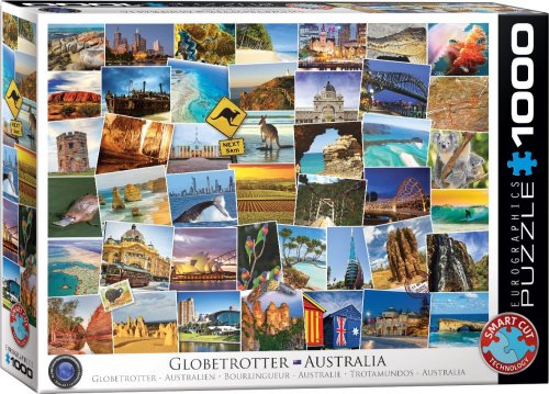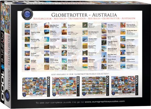Puzzle EUROGRAPHICS z kolekce Globetrotter Collection (Světoběžník) s popisem na zadní straně krabičky (v angličtině). Vydejte se napříč Austrálií a poznejte překrásná zákoutí, úchvatné památky, podivuhodná zvířata a další zajímavosti typické pro tento kontinent.