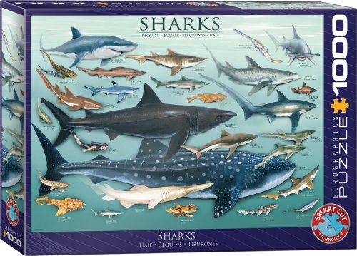 Puzzle s vyobrazením nejznámějších druhů žraloků. U každého obrázku je uveden anglický a latinský název a velikost žraloka v palcích a v závorce pak i v centimetrech.