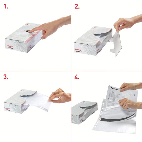 Závěsné obaly „U” v praktickém balení v kartonové krabičce; snadná manipulace s jednotlivými obaly; krabičku lze umístit svisle i vodorovně; nahoře otevřené; europerforace