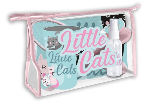 EUROSWAN Kosmetická taška vybavená Kočičky Materiál: 100% Polyester, PVC Rozměr: 23x15x8 cm Průhledná kosmetická taška se zapínáním na zip, 1xkelímek, 1xpouzdro na kartáček,1xkartáč na vlasy,1x lahvička s rozprašovačem,1xručníček s poutkem na zavěšení, velikost ručníčku 45x28 cm