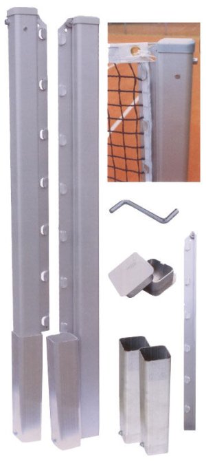 Tenisové sloupky Evo 80 z eloxovaného hliníku. Mají čtvercový profil 80x80 mm se zaoblenými hranami.