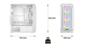 Na první dobrou byste možná řekli, že počítačová skříň o rozměrech 204 × 420 × 355 mm a hmotnosti 4,5 kg nemůže nabízet nic extra. Jenže to by nesměla být řeč o EVOLVEO Xenon-WH-4 – počítačové skříni, u které je přijatelná velikost v dokonalé rovnováze s velkorysostí vnitřního prostoru. Její zásluhou se vám stolní počítač bez problému vejde na stůl i do skromného herního koutku, ovšem do nitra skříně se vejde vše, co si vaše neskromné herní ambice žádají.