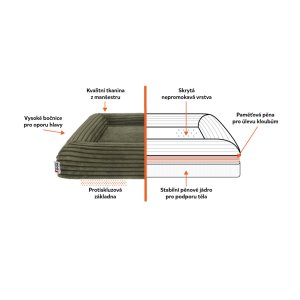 Jádro pelechu tvoří 8 cm vysoká polyuretanová pěna (PUR) o hustotě 25D, která slouží jako pevná a odolná základna. Na ní leží 2 cm paměťové pěny o hustotě 40D, která se přizpůsobí tvaru těla psa, rovnoměrně rozloží tlak a uleví kloubům i páteři. Celková výška matrace je 10 cm, což zajišťuje pohodlí bez přehnaného propadání a současně usnadňuje pohyb v pelíšku. Bočnice vysoké 20 cm tvoří přirozenou oporu hlavy a zároveň pomáhají vytvořit chráněný a útulný prostor. Pes se tak může snadno uvolnit a nerušeně odpočívat, bez stresu a vyrušení.