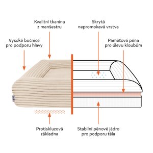 Použité materiály splňují nejpřísnější standardy na kvalitu a bezpečnost. Potah z hebkého manšestru má certifikaci OEKO-TEX Standard 100, která zaručuje, že neobsahuje žádné škodlivé látky. Manšestr je vyrobený ze 100% polyesteru, na rozdíl od bavlny nevsakuje snadno vodu, rychleji schne a je více odolný proti zápachu. Samotná ortopedická matrace je vyrobena z pěn certifikovaných podle CertiPUR-US, tedy bez formaldehydu, těžkých kovů a dalších škodlivých látek. Díky odolným zipům YKK lze potah snadno sejmout a vyprat v pračce, což zajišťuje nejen hygienu, ale i dlouhodobou udržitelnost celého pelechu.