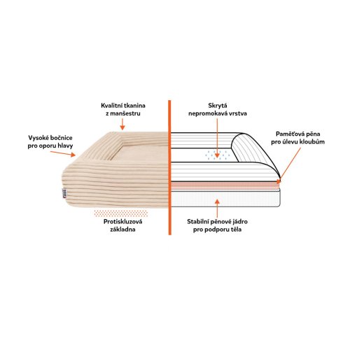 Jádro pelechu tvoří 8 cm vysoká polyuretanová pěna (PUR) o hustotě 25D, která slouží jako pevná a odolná základna. Na ní leží 2 cm paměťové pěny o hustotě 40D, která se přizpůsobí tvaru těla psa, rovnoměrně rozloží tlak a uleví kloubům i páteři. Celková výška matrace je 10 cm, což zajišťuje pohodlí bez přehnaného propadání a současně usnadňuje pohyb v pelíšku. Bočnice vysoké 20 cm tvoří přirozenou oporu hlavy a zároveň pomáhají vytvořit chráněný a útulný prostor. Pes se tak může snadno uvolnit a nerušeně odpočívat, bez stresu a vyrušení.