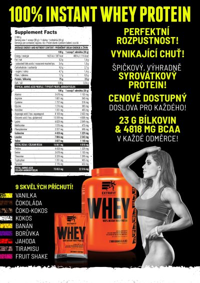 100% Whey Protein od Extrifitu je výborně stravitelný ryzí syrovátkový protein za skvělou cenu. Tento protein je plně instantní, rychle se rozpouští a jeho příprava je mimořádně snadná. Hotový nápoj má velmi příjemnou konzistenci. Díky prvotřídnímu zdroji bílkovin přispívá 100% Whey Protein k růstu svalové hmoty a k jejímu udržení v situacích, kdy je ohrožena katabolizací. V každé dávce se můžete těšit na plných 23 g bílkovin té nejvyšší kvality. Hlavní proteinová složka pochází z ověřeného evropského zdroje. Hlavní přednosti:
