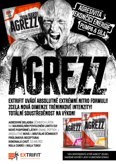 Celkem 8 850 mg pumpovacích látek: citrulin DL-malát, arginin a prémiová složka PepForm® Arginine Peptides – mimořádně silný arginin v peptidové formě! Jedná se o unikátní složku, kterou používají jen ty nejdražší a nejlepší produkty na trhu! Aminokyselina beta-alanin v ohromné dávce 4 000 mg pro maximální výdrž svalů. Aminokyselina tyrosin v dávce 1 000 mg pro dosažení optimálního fyzického a mentálního výkonu. Kofein, taurin a extrakt zeleného čaje podpoří soustředění na výkon, nakopnou a oddálí pocit únavy. Vy tak budete moct efektivně trénovat po delší dobu než normálně! DMAE a inosin: moderní předtréninkové látky, které najdete jen v těch nejpokročilejších produktech. Každý sáček skrývá maximální povolenou denní dávku DMAE, kterou můžete v ČR pořídit! Piperin (extrakt z pepře): velmi ceněná látka s řadou pozitivních účinků na zdraví – podporuje imunitu, činnost jater, krevní oběh v malých cévách a maximalizuje účinky ostatních látek v produktu. Cholin a synefrin (extrakt z pomerančovníku) přispívají k využití tuků v energetickém metabolismu. Na své si tak přijdou i sportovci v rýsovací fázi a ti, kteří si hlídají tělesnou hmotnost. Extra silný pre-workout vhodný i do diety Velkou výhodou produktu je nulový obsah sacharidů a tuku. Produkt je tak vhodný i pro sportovce ve fázi rýsování. Navíc díky účinným látkám, jako jsou zelený čaj, piperin nebo cholin, podporuje AGREZZ® efektivní metabolismus tuků. Tento produkt je určen pro náročné sportovce. Zažijete novou dimenzi tréninku! Je to skutečně silný produkt, dodržujte tedy doporučené dávkování a neužívejte jej krátce před spánkem. Je tak silný, že jeho účinek by mohl přetrvávat i v době, kdy již potřebujete regenerovat. Dokonalá chuť v praktickém balení Většina pre-workoutů nechutná dobře, to ale není případ produktu AGREZZ®! Díky mnohaletým zkušenostem s ochucováním suplementů jsme všechny příchutě vyladili k absolutní dokonalosti. Vzhledem k vysokému obsahu a typu účinných látek se tak jedná o naprostý unikát! A abyste nemuseli odsypávat prášek z velkého balení, Extrifit® pro Vás připravil produkt v sáčcích, ve kterých je dávka naprosto přesně odměřena. Sáček je malý, praktický a můžete jej vzít s sebou kamkoliv. V případě potřeby stačí rozpustit ve vodě a nápoj je hotov!