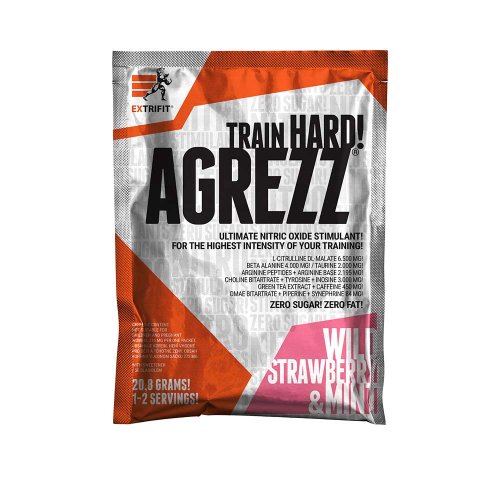 Celkem 8 850 mg pumpovacích látek: citrulin DL-malát, arginin a prémiová složka PepForm® Arginine Peptides – mimořádně silný arginin v peptidové formě! Jedná se o unikátní složku, kterou používají jen ty nejdražší a nejlepší produkty na trhu! Aminokyselina beta-alanin v ohromné dávce 4 000 mg pro maximální výdrž svalů. Aminokyselina tyrosin v dávce 1 000 mg pro dosažení optimálního fyzického a mentálního výkonu. Kofein, taurin a extrakt zeleného čaje podpoří soustředění na výkon, nakopnou a oddálí pocit únavy. Vy tak budete moct efektivně trénovat po delší dobu než normálně! DMAE a inosin: moderní předtréninkové látky, které najdete jen v těch nejpokročilejších produktech. Každý sáček skrývá maximální povolenou denní dávku DMAE, kterou můžete v ČR pořídit! Piperin (extrakt z pepře): velmi ceněná látka s řadou pozitivních účinků na zdraví – podporuje imunitu, činnost jater, krevní oběh v malých cévách a maximalizuje účinky ostatních látek v produktu. Cholin a synefrin (extrakt z pomerančovníku) přispívají k využití tuků v energetickém metabolismu. Na své si tak přijdou i sportovci v rýsovací fázi a ti, kteří si hlídají tělesnou hmotnost. Extra silný pre-workout vhodný i do diety Velkou výhodou produktu je nulový obsah sacharidů a tuku. Produkt je tak vhodný i pro sportovce ve fázi rýsování. Navíc díky účinným látkám, jako jsou zelený čaj, piperin nebo cholin, podporuje AGREZZ® efektivní metabolismus tuků. Tento produkt je určen pro náročné sportovce. Zažijete novou dimenzi tréninku! Je to skutečně silný produkt, dodržujte tedy doporučené dávkování a neužívejte jej krátce před spánkem. Je tak silný, že jeho účinek by mohl přetrvávat i v době, kdy již potřebujete regenerovat. Dokonalá chuť v praktickém balení Většina pre-workoutů nechutná dobře, to ale není případ produktu AGREZZ®! Díky mnohaletým zkušenostem s ochucováním suplementů jsme všechny příchutě vyladili k absolutní dokonalosti. Vzhledem k vysokému obsahu a typu účinných látek se tak jedná o naprostý unikát! A abyste nemuseli odsypávat prášek z velkého balení, Extrifit® pro Vás připravil produkt v sáčcích, ve kterých je dávka naprosto přesně odměřena. Sáček je malý, praktický a můžete jej vzít s sebou kamkoliv. V případě potřeby stačí rozpustit ve vodě a nápoj je hotov!