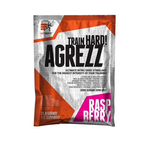 Celkem 8 850 mg pumpovacích látek: citrulin DL-malát, arginin a prémiová složka PepForm® Arginine Peptides – mimořádně silný arginin v peptidové formě! Jedná se o unikátní složku, kterou používají jen ty nejdražší a nejlepší produkty na trhu! Aminokyselina beta-alanin v ohromné dávce 4 000 mg pro maximální výdrž svalů. Aminokyselina tyrosin v dávce 1 000 mg pro dosažení optimálního fyzického a mentálního výkonu. Kofein, taurin a extrakt zeleného čaje podpoří soustředění na výkon, nakopnou a oddálí pocit únavy. Vy tak budete moct efektivně trénovat po delší dobu než normálně! DMAE a inosin: moderní předtréninkové látky, které najdete jen v těch nejpokročilejších produktech. Každý sáček skrývá maximální povolenou denní dávku DMAE, kterou můžete v ČR pořídit! Piperin (extrakt z pepře): velmi ceněná látka s řadou pozitivních účinků na zdraví – podporuje imunitu, činnost jater, krevní oběh v malých cévách a maximalizuje účinky ostatních látek v produktu. Cholin a synefrin (extrakt z pomerančovníku) přispívají k využití tuků v energetickém metabolismu. Na své si tak přijdou i sportovci v rýsovací fázi a ti, kteří si hlídají tělesnou hmotnost. Extra silný pre-workout vhodný i do diety Velkou výhodou produktu je nulový obsah sacharidů a tuku. Produkt je tak vhodný i pro sportovce ve fázi rýsování. Navíc díky účinným látkám, jako jsou zelený čaj, piperin nebo cholin, podporuje AGREZZ® efektivní metabolismus tuků. Tento produkt je určen pro náročné sportovce. Zažijete novou dimenzi tréninku! Je to skutečně silný produkt, dodržujte tedy doporučené dávkování a neužívejte jej krátce před spánkem. Je tak silný, že jeho účinek by mohl přetrvávat i v době, kdy již potřebujete regenerovat. Dokonalá chuť v praktickém balení Většina pre-workoutů nechutná dobře, to ale není případ produktu AGREZZ®! Díky mnohaletým zkušenostem s ochucováním suplementů jsme všechny příchutě vyladili k absolutní dokonalosti. Vzhledem k vysokému obsahu a typu účinných látek se tak jedná o naprostý unikát! A abyste nemuseli odsypávat prášek z velkého balení, Extrifit® pro Vás připravil produkt v sáčcích, ve kterých je dávka naprosto přesně odměřena. Sáček je malý, praktický a můžete jej vzít s sebou kamkoliv. V případě potřeby stačí rozpustit ve vodě a nápoj je hotov!
