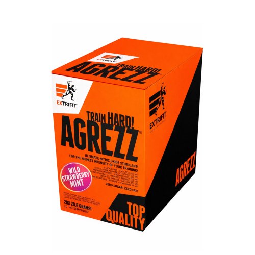 Celkem 8 850 mg pumpovacích látek: citrulin DL-malát, arginin a prémiová složka PepForm® Arginine Peptides – mimořádně silný arginin v peptidové formě! Jedná se o unikátní složku, kterou používají jen ty nejdražší a nejlepší produkty na trhu! Aminokyselina beta-alanin v ohromné dávce 4 000 mg pro maximální výdrž svalů. Aminokyselina tyrosin v dávce 1 000 mg pro dosažení optimálního fyzického a mentálního výkonu. Kofein, taurin a extrakt zeleného čaje podpoří soustředění na výkon, nakopnou a oddálí pocit únavy. Vy tak budete moct efektivně trénovat po delší dobu než normálně! Inosin: moderní předtréninková látka, kterou najdete jen v těch nejpokročilejších produktech. Piperin (extrakt z pepře): velmi ceněná látka s řadou pozitivních účinků na zdraví – podporuje imunitu, činnost jater, krevní oběh v malých cévách a maximalizuje účinky ostatních látek v produktu. Cholin a synefrin (extrakt z pomerančovníku) přispívají k využití tuků v energetickém metabolismu. Na své si tak přijdou i sportovci v rýsovací fázi a ti, kteří si hlídají tělesnou hmotnost. Extra silný pre-workout vhodný i do diety Velkou výhodou produktu je nulový obsah sacharidů a tuku. Produkt je tak vhodný i pro sportovce ve fázi rýsování. Navíc díky účinným látkám, jako jsou zelený čaj, piperin nebo cholin, podporuje AGREZZ® efektivní metabolismus tuků. Tento produkt je určen pro náročné sportovce. Zažijete novou dimenzi tréninku! Je to skutečně silný produkt, dodržujte tedy doporučené dávkování a neužívejte jej krátce před spánkem. Je tak silný, že jeho účinek by mohl přetrvávat i v době, kdy již potřebujete regenerovat. Dokonalá chuť v praktickém balení Většina pre-workoutů nechutná dobře, to ale není případ produktu AGREZZ®! Díky mnohaletým zkušenostem s ochucováním suplementů jsme všechny příchutě vyladili k absolutní dokonalosti. Vzhledem k vysokému obsahu a typu účinných látek se tak jedná o naprostý unikát! A abyste nemuseli odsypávat prášek z velkého balení, Extrifit® pro Vás připravil produkt v sáčcích, ve kterých je dávka naprosto přesně odměřena. Sáček je malý, praktický a můžete jej vzít s sebou kamkoliv. V případě potřeby stačí rozpustit ve vodě a nápoj je hotov!