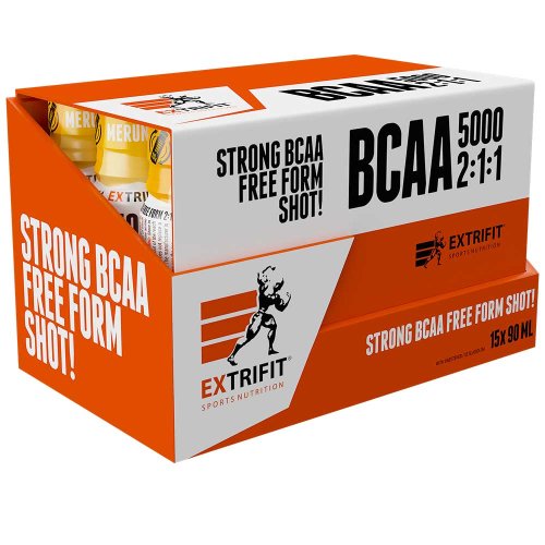 BCAA 5000 MG je doplněk stravy od firmy Extrifit obsahující tekuté volné větvené aminokyseliny leucin, izoleucin a valin ve formě „shotu“ – nápoje určeného k jednorázové konzumaci. Hotová tekutka! Nic nemusíš míchat! Hoď to do sebe a jdi na to! Tyhle BCAA mají 5000 mg v jediné lahvičce! (ne 3000, jako ostatní…!) BCAA jsou základním stavebním kamenem svalové hmoty a prostředkem k růstu a regeneraci. Základ suplementace pro všechny! BCAA – volné větvené aminokyseliny L-leucin, L-izoleucin a L-valin se řadí mezi esenciální (nepostradatelné) aminokyseliny a jsou obsaženy přímo ve svalové tkáni, kde mohou být využity jako důležitý zdroj energie pro svalovou práci. Větvené aminokyseliny jsou obsaženy ve stravě, jsou tedy látkou lidskému tělu naprosto přirozenou. Větvené aminokyseliny leucin, izoleucin a valin jsou ve sportovní výživě považovány za suplement, o jehož účinku už nikdo nepochybuje. Užívají je sportovci všech sportovních disciplín. Někteří pro nárůst čisté svalové hmoty, někteří pro její ochranu před katabolizací a jiní pro rychlou a efektivní regeneraci. Pro účinek BCAA je stěžejní SPRÁVNÉ NAČASOVÁNÍ jejich příjmu a také FORMA, v jaké BCAA přijmete. Je možné užívat BCAA i v průběhu dne, například při rýsování, základní užívání je ale v čase okolo tréninku. A tehdy potřebujete takovou formu BCAA, která se co nejrychleji vstřebá a také nebude zatěžovat váš trávicí trakt. To vám může nabídnout tento náš produkt. Jeden shot obsahuje celých 5000 mg čistých BCAA! Doporučené dávkování: