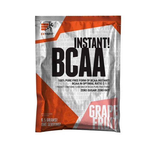 UPOZORNĚNÍ: Dochází k doprodeji původních obalů (sáčků), na kterých naleznete drobné rozpory s údaji na této produktové stránce. Pro jednorázový sáček platí údaje, které aktuálně čtete. Obsah sáčků je stejný jako u velkého balení o hmotnosti 300 g, jedná se tak o zcela totožný produkt. Zcela typickou vlastností BCAA Instant je mírně nahořklá chuť nápoje. Jak je to možné? Nahořklá chuť je charakteristická pro produkty s velmi vysokým obsahem BCAA. Všimněte si, že jeden sáček, který váží 6,5 g, obsahuje celých 5 g čistých BCAA! U jiných značek často nenajdete v dávce ani polovinu BCAA. Zkrátka Extrifit® vyrobil špičkové instantní BCAA – bez cukrů, tuku a jakýchkoli náhražek! O aminokyselinách BCAA BCAA – větvené aminokyseliny L-leucin, L-izoleucin a L-valin – se řadí mezi esenciální (nepostradatelné) aminokyseliny a jsou obsaženy přímo ve svalové tkáni, kde mohou být využity jako důležitý zdroj energie pro svalovou práci, případně jako stavební kameny pro tvorbu svalové hmoty. Aminokyseliny BCAA jsou běžně obsaženy ve stravě, jsou tedy lidskému tělu naprosto přirozenými látkami. Optimální poměr 2 : 1 : 1 Poměr 2 : 1 : 1 odpovídá fyziologické potřebě a zastoupení BCAA v živočišných bílkovinách, které se považují za ty nejkvalitnější pro podporu růstu svalové hmoty a její ochrany. Při vyšším podílu leucinu (např. 8 : 1 : 1) nemusí dojít k jeho většímu využití, ba dokonce může narušit využití ostatních BCAA, protože platí Wolfův zákon o nadbytku esenciálních aminokyselin ("příjem libovolné esenciální aminokyseliny ve velkém nadbytku narušuje metabolismus ostatních aminokyselin a zesiluje projevy limitní aminokyseliny"). Poměr 2 : 1 : 1 je tedy pro maximální využití BCAA optimální. Dosažení maximálních účinků BCAA Pro účinek BCAA je stěžejní správné načasování jejich příjmu a také forma, v jaké BCAA přijmete. Je možné užívat BCAA i v průběhu dne, například při rýsování, základní užívání je ale v čase okolo tréninku. A tehdy potřebujete takovou formu BCAA, která se co nejrychleji vstřebá a také nebude zatěžovat trávicí systém. Pro tento účel jsou ideální BCAA Instant. Z nápoje se volné větvené aminokyseliny skvěle vstřebají, jsou téměř okamžitě k dispozici pro svaly a zároveň ještě dodáte tělu potřebné tekutiny ve formě chutného nápoje. Splňují nejnáročnější požadavky sportovců Díky nulovému obsahu cukrů a tuku je nápoj vhodný i při striktních dietách a při rýsování. BCAA Instant od Extrifitu jsou dokonale rozpustné, nápoj je připraven za několik vteřin a můžete si jej vzít kamkoliv v průběhu dne, začít jej pít před tréninkem a pokračovat při něm, zkrátka jak potřebujete. BCAA Instant vyhovují ve všech parametrech i těm nejnáročnějším sportovcům. Vojta Koritenský pije až 20 gramů BCAA Instant v průběhu celého dne! Klíčové výhody BCAA Instant: