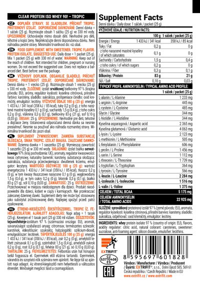 Balení obsahuje 16 ks. Revoluce ve tvém šejkru Že na klasiku nic nemá? Omyl. Už po prvním napití pochopíš, že Clear Protein Iso Whey 90! je chybějící zbraní ve tvém proteinovém arzenálu. Nakrmíš svaly nejkvalitnějšími bílkovinami a zároveň se skvěle osvěžíš. A z čeho ti zaručeně spadne opasek? 97 % syrovátkového izolátu, 0 g cukrů, 0 g tuků! Proč si oblíbíš Clear od Extrifitu®: