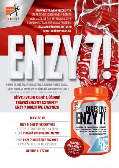 S doplňkem Enzy 7! Digestive Enzymes využijete dokonale každou živinu. A to nejen z běžného jídla, ale i ze suplementů, jakými jsou například Vaše oblíbené proteinové nápoje nebo různé instantní kaše (Protein Break!, Rice & Oat Mash aj.) U sportovců má zhoršené trávení negativní dopad na sportovní výkon i následnou regeneraci. Sportovci nutně potřebují tělu zajistit dostatečný příjem žádoucích živin. Proto je při nízké produkci enzymů užívání produktu Enzy 7! Digestive Enzymes velmi efektivním řešením. Produkt je vhodné užívat před konzumací větších porcí s kombinovaným zastoupením bílkovin, sacharidů, tuků a vlákniny. Pomůže Vám i s trávením velmi složitých jídel, jako je občasná nedělní kachna či řízek s bramborovým salátem. Tedy nejen při dietní stravě. Enzy 7! Digestive Enzymes je naplněn v kapslích, které se rychle a dobře tráví, což je pro jejich účinek velmi důležité. Enzymy jsou v originálních kapslích s logem Extrifit®. Logo je natištěno přírodním barvivem. Doporučené dávkování: