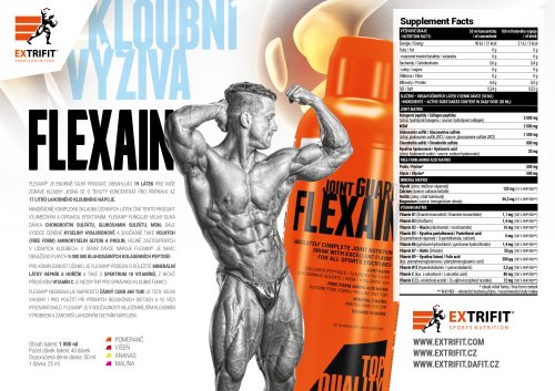 19 účinných látek! masivní množství kloubních ingrediencí v každé denní dávce extrémní dávka chondroprotektiv: kyselina hyaluronová, chondroitin, glukosamin, MSM, hydrolyzované kolagenní peptidy kloubní aminokyseliny Prolin a Glycin ve volné formě kostní minerály hořčík a vápník – nastaveny na optimálních 15 % denní doporučené dávky (RHP) obsahuje 10 důležitých vitamínů – všechny nastaveny na 100 % denní doporučené dávky (RHP) tekutá forma zajišťuje vynikající vstřebatelnost a využitelnost bez chemických barviv žádný cukr! žádný tuk! 40 dávek v jediné lahvi mimořádně lahodný nápoj s ovocnými příchutěmi vhodný i při nejpřísnější dietě! Flexain® ve formě koncentrátu je velmi vhodný i pro osoby, které zapomínají pravidelně pít. Jednu dávku produktu Flexain® (25 ml) si rozředíte ve 400 ml vody. Tím vznikne vynikající drink a hned víte, že jste udělali správnou věc jak pro Vaše klouby, tak i pro Váš pitný režim. Flexain® je určen i pro náročné sportovce, proto obsahuje vysoké dávky těch nejdůležitějších chondroprotektiv v unikátní kombinaci. To vše nikoliv v obřích tabletách, ale ve formě lahodného nápoje, který chutná jako skutečná ovocná šťáva! Díky této tekuté formě se všechny účinné látky rychleji vstřebají. Ke zvýšené zátěži kloubů dochází jak u silového tréninku, tak u vytrvalostních sportů, Flexain® je tedy vhodný pro široké spektrum sportovců. Z jednoho balení připravíte až 17 litrů nápoje! Flexain® je obohacen o silný komplex vitamínů, z nichž především vitamín C přispívá k normální tvorbě kolagenu v krevních cévách, chrupavkách a kostech. Velkou výhodou produktu je to, že má nulový obsah tuku a cukrů, je tak možné jej užívat i při přísné redukční dietě a při rýsování svalů! Doporučené dávkování: