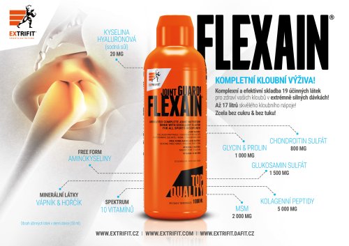 19 účinných látek! masivní množství kloubních ingrediencí v každé denní dávce extrémní dávka chondroprotektiv: kyselina hyaluronová, chondroitin, glukosamin, MSM, hydrolyzované kolagenní peptidy kloubní aminokyseliny Prolin a Glycin ve volné formě kostní minerály hořčík a vápník – nastaveny na optimálních 15 % denní doporučené dávky (RHP) obsahuje 10 důležitých vitamínů – všechny nastaveny na 100 % denní doporučené dávky (RHP) tekutá forma zajišťuje vynikající vstřebatelnost a využitelnost bez chemických barviv žádný cukr! žádný tuk! 40 dávek v jediné lahvi mimořádně lahodný nápoj s ovocnými příchutěmi vhodný i při nejpřísnější dietě! Flexain® ve formě koncentrátu je velmi vhodný i pro osoby, které zapomínají pravidelně pít. Jednu dávku produktu Flexain® (25 ml) si rozředíte ve 400 ml vody. Tím vznikne vynikající drink a hned víte, že jste udělali správnou věc jak pro Vaše klouby, tak i pro Váš pitný režim. Flexain® je určen i pro náročné sportovce, proto obsahuje vysoké dávky těch nejdůležitějších chondroprotektiv v unikátní kombinaci. To vše nikoliv v obřích tabletách, ale ve formě lahodného nápoje, který chutná jako skutečná ovocná šťáva! Díky této tekuté formě se všechny účinné látky rychleji vstřebají. Ke zvýšené zátěži kloubů dochází jak u silového tréninku, tak u vytrvalostních sportů, Flexain® je tedy vhodný pro široké spektrum sportovců. Z jednoho balení připravíte až 17 litrů nápoje! Flexain® je obohacen o silný komplex vitamínů, z nichž především vitamín C přispívá k normální tvorbě kolagenu v krevních cévách, chrupavkách a kostech. Velkou výhodou produktu je to, že má nulový obsah tuku a cukrů, je tak možné jej užívat i při přísné redukční dietě a při rýsování svalů! Doporučené dávkování:
