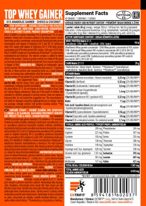isomaltulózou (palatinóza), moderním sportovním sacharidem, který Vám dá tolik energie jako cukr, ovšem uvolňuje se postupně a má velmi nízký GI (glykemický index) kukuřičným škrobem, vynikajícím komplexním polysacharidem maltodextrinem, tradičním oligosacharidem, velmi populárním ve sportovní výživě dextrózou, přírodním hroznovým cukrem Tedy G 15 Gainer disponuje vyváženou kombinací sacharidových zdrojů pro podporu regenerace po výkonu. Pro vyšší účinnost produktu je přidán komplex 10 vitamínů: