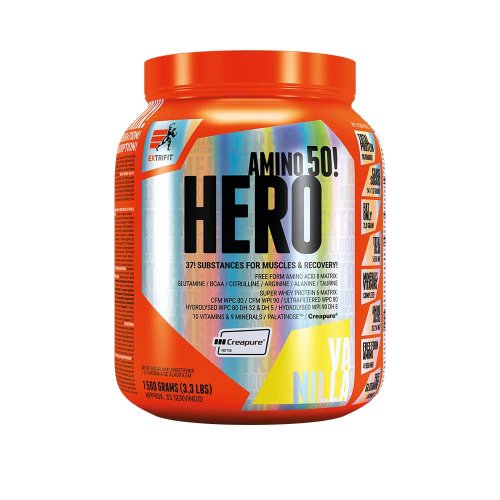 vitamín B1 - 1,2 mg/100 g (111% RHP) – přispívá k normálnímu energetickému metabolismu, k normální činnosti nervové soustavy, k činnosti srdce a k normální psychické činnosti vitamín B2 - 1,6 mg/100 g (111% RHP) - přispívá k normálnímu energetickému metabolismu, k normální činnosti nervové soustavy, ke snížení míry únavy a vyčerpání a k ochraně buněk před oxidativním stresem vitamín B3 - 17,8 mg/100 g (111% RHP) - přispívá k normálnímu energetickému metabolismu, k normální činnosti nervové soustavy, ke snížení míry únavy a vyčerpání a k normální psychické činnosti vitamín B5 - 6,7 mg/100 g (111% RHP) - přispívá k normálnímu energetickému metabolismu, k normální syntéze metabolismu steroidních hormonů, vitaminu D a některých neurotransmiterů, přispívá ke snížení míry únavy a vyčerpání a k normální mentální činnosti vitamín B6 - 1,6 mg/100 g (111% RHPI) - přispívá k normálnímu energetickému metabolismu, k normálnímu metabolismu bílkovin a glykogenu, k normální činnosti nervové soustavy, k regulaci hormonální aktivity, přispívá k normální funkci imunitního systému, ke snížení míry únavy a vyčerpání a k normální psychické činnosti biotin - 0,06 mg/100 g (111% RHP) - přispívá k normálnímu energetickému metabolismu, k normální činnosti nervové soustavy, k normálnímu metabolismu makroživin a k normální psychické činnosti kyselina listová - 0,22 mg/100 g (111% RHP) - přispívá k normální syntéze aminokyselin, k normální krvetvorbě, k normální funkci imunitního systému, ke snížení míry únavy a vyčerpání a k normální psychické činnosti vitamín B12 - 0,00278 mg/100 g (111% RHP) - přispívá k normálnímu energetickému metabolismu, k normální činnosti nervové soustavy, k normální psychické činnosti, k normální funkci imunitního systému a ke snížení míry únavy a vyčerpání vitamín C - 89 mg/100 g (111% RHP) - přispívá k udržení normální funkce imunitního systému během intenzivního fyzického výkonu a po něm, k normální tvorbě kolagenu pro normální funkci krevních cév, chrupavek a kostí, přispívá k normálnímu energetickému metabolismu, k normální činnosti nervové soustavy, k normální psychické činnosti, k normální funkci imunitního systému, k ochraně buněk před oxidativním stresem a ke snížení míry únavy a vyčerpání vitamín E - 13 mg/100 g (111 % RHP) – přispívá k ochraně buněk před oxidativním stresem Díky obsahu proteinů přispívá Hero k růstu síly a svalové hmoty a k jejímu udržení v situacích, kdy je ohrožena katabolizací, jako je třeba velmi intenzivní či dlouhotrvající trénink. Hero je skvělou investicí! 37 všech účinných látek, nutných pro doplnění po tréninku, nenabízí žádný jiný produkt! Není třeba nakupovat jednotlivé potréninkové suplementy každý zvlášť! Extrifit Vám nabízí Hero ve vícero výborných příchutích. Připravený nápoj má krémovou konzistenci a skvělou chuť.