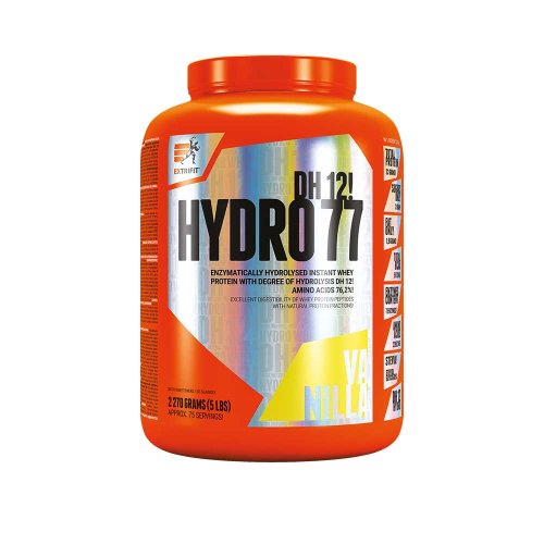 Co znamená, že je protein hydrolyzovaný? Procesem hydrolýzy jsou bílkovinné vazby rozštěpeny proteázovými enzymy (enzymy štěpícími bílkoviny) na aminokyseliny s dlouhým řetězcem. Tyto aminokyseliny se nazývají polypeptidy. Jedná se o enzymatický proces hydrolyzace - pre-digestion („předžvýkání"). Jeho produktem je pro tělo skvěle využitelná bílkovina ve formě peptidů, které zahrnují: oligopeptidy (mají více jak 12 aminokyselin), dipeptidy (mají 2 aminokyseliny), tripeptidy (mají 3 aminokyseliny), tetrapeptidy (mají 4 aminokyseliny), pentapeptidy (mají 5 aminokyselin) atd. Index biologické využitelnosti BV 104 - 107. Stupeň hydrolýzy – nejdůležitější údaj, který určuje kvalitu hydrolyzovaného proteinu. Proteiny mohou být vystaveny procesu hydrolýzy různou mírou, neboli mohou mít různě vysoký stupeň hydrolýzy. Na rozdíl od některých jiných výrobců v Extrifitu uvádí stupeň hydrolýzy nejen na etiketě výrobku, ale je obsažen přímo v jeho názvu - DH12, což je vysoký stupeň hydrolýzy, díky němuž má tento výrobek vysoký obsah krátkých peptidů. Proteiny s vysokým stupněm hydrolýzy jsou typické tím, že mají mírně, ale opravdu mírně a ne nepříjemně nahořklou chuť, což můžete pocítit i u výrobku Extrifit, a je to dokladem toho, že se jedná o skutečně kvalitní hydrolyzovaný produkt. Vyhněte se tzv. hydrům, které neuvádí stupeň hydrolýzy. Obvykle je to v takovém případě maximálně stupeň 4, který nemá význam v rychlosti vstřebávání bílkoviny. Jen je dražší. Známkou kvality proteinových přípravků je i obsah jednotlivých bílkovinných frakcí, který Extrifit na etiketě tohoto výrobku jasně deklaruje: Hydro 77 DH12 obsahuje beta laktoglobulin 36 %, alfa laktalbumin 15 %, imunoglobulin 2,5 %, bovinní sérový albumin 2,5 %, bílkovinné frakce syrovátky s molární hmotností 500 – 1000 Da 4 % a bílkovinné frakce syrovátky s molární hmotností < 500 KDa 40 %. Obsah aminokyselin ve 100 g Hydro 77 DH12 je podle jednotlivých příchutí 76165 - 79458 mg. Jeho výhodou je také nízký obsah sacharidů a tuku. Příjem tohoto vysoce kvalitního zdroje proteinu přispívá k růstu svalové hmoty a k jejímu udržení v situacích, kdy je ohrožena katabolizací.