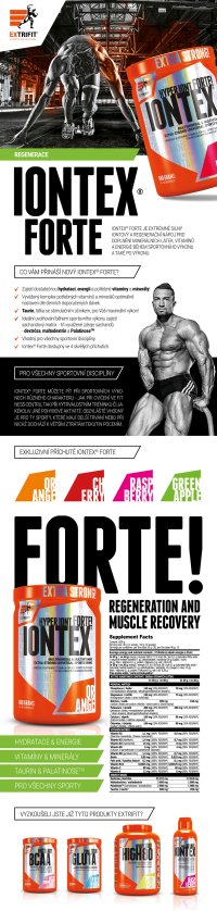 Iontex ® Forte je špičkově sestavený iontový a regenerační nápoj pro doplnění minerálních látek, vitamínů a energie během sportovního výkonu a také po výkonu. Množství minerálů a vitamínů je optimálně nastaveno podle denních doporučených dávek. Zdrojem energie je taurin a sacharidový matrix s obsahem palatinózy (IsomaltuloseTM). Energie se tak ideálně uvolňuje. Iontex ® Forte můžete pít při sportovních výkonech různého charakteru - jak při cvičení ve fitness centru, tak při vytrvalostním tréninku či jakékoliv jiné pohybové aktivitě. Obzvláště vhodný je pro ty sporty, které mají delší trvání či při nichž dochází k větším ztrátám tekutin pocením. Zajistí Vám dostatečnou hydrataci, energii a potřebné vitamíny a minerály! Iontex® Forte obsahuje tři vyvážené zdroje sacharidů - dextrózu, maltodextrin a isomaltulózu (palatinóza), taurin, látku se stimulačním účinkem, která podpoří Váš výkon, a zmíněný vyvážený komplex potřebných vitamínů a minerálů. Iontex Forte Vám Extrifit nabízí v několika příchutích, všechny chutnají výtečně! Doporučené dávkování: