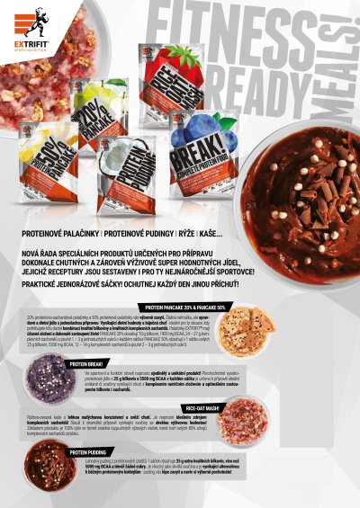 proteinovo-sacharidová palačinka ze zdravých, přírodních surovin pohanka, rýže, oves vláknina z kořene čekanky syrovátkový (whey) protein 80% 10 g bílkovin a 1900 mg BCAA v každé palačince 24 – 27 g komplexních polysacharidů s nízkým glykemickým indexem pouhé 1-3 g jednoduchých cukrů! Proteinovo-sacharidové palačinky Extrifit® Pancake 20 % jsou opravdovým proteinovým jídlem, které Vás výborně zasytí a které si doma jednoduše uvaříte. Proteinové koktejly jsou fajn, o jejich přínosu pro růst svalové hmoty není třeba diskutovat, ovšem velice často máte po nich brzy hlad a začne Vás honit mlsná. Přeci jen nezaplní Váš žaludek dostatečně, zejména v období diety. Proteinovo-sacharidová palačinka Pancake 20 % toto řeší. Skutečně si uvaříte. Žádná náhražka jídla, ale opravdové a dietní jídlo a příjemné, avšak nijak náročné vaření. Vynikající dietní hodnoty a báječná chuť palačinek. Proteinovo-sacharidové palačinky od Extrifit jsou ideální pro ty situace, kdy potřebujete tělu dodat kombinaci kvalitní bílkoviny a kvalitních komplexních sacharidů. Mají úžasné komplexní složení a dokonalé zastoupení živin. Kombinace pohanky, ovsa, rýže a syrovátkového 80% proteinového koncentrátu tvoří plnohodnotné jídlo s ideálním zastoupením bílkovin a sacharidů. Uvedené suroviny jsou doplněny o inulin z kořene čekanky, vlákninu s prebiotickým účinkem. Použité přírodní suroviny: