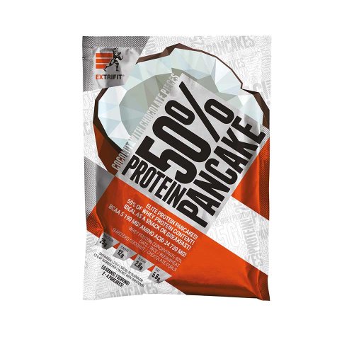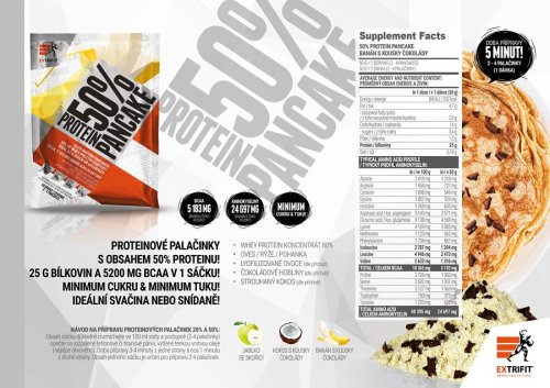 obsah bílkovin 50 %! whey protein 80% - výhradní a nejkvalitnější zdroj bílkovin – vyplňuje celou polovinu každého sáčku 5200 mg BCAA v každém sáčku pouhých 2 - 3 g jednoduchých sacharidů v celém sáčku baleno v jednotlivých sáčcích 1 sáček = 1 dávka = 25 g bílkovin vše odměřeno v každém sáčku – žádné vážení pravé sušené a lyofilizované ovoce a vysoce kvalitní čokoláda s pouhými 1,2 g cukru v celém sáčku velmi lahodná a dietní snídaně či svačina sacharidová složka ze špičkových zdrojů: oves + rýže + pohanka naprosto jednoduchá příprava díky dávce v jednorázovém sáčku žádné kupování velké drahé dózy s jedinou příchutí, která se Vám za chvíli přejí nyní můžete mít každý den jinou příchuť proteinové palačinky doslova za pár korun Extrifit® přichází s úplně novou řadou produktů. Jedná se o speciální produkty určené pro přípravu dokonale chutných a zároveň výživově super hodnotných jídel, jejichž receptury jsou sestaveny i pro ty nejnáročnější sportovce. Jednou z těchto novinek jsou i palačinky, které Vám nabízíme ve dvou variantách, jednak proteinovo-sacharidové palačinky s obsahem bílkovin 20 %, jednak proteinové palačinky s obsahem bílkovin 50 %.